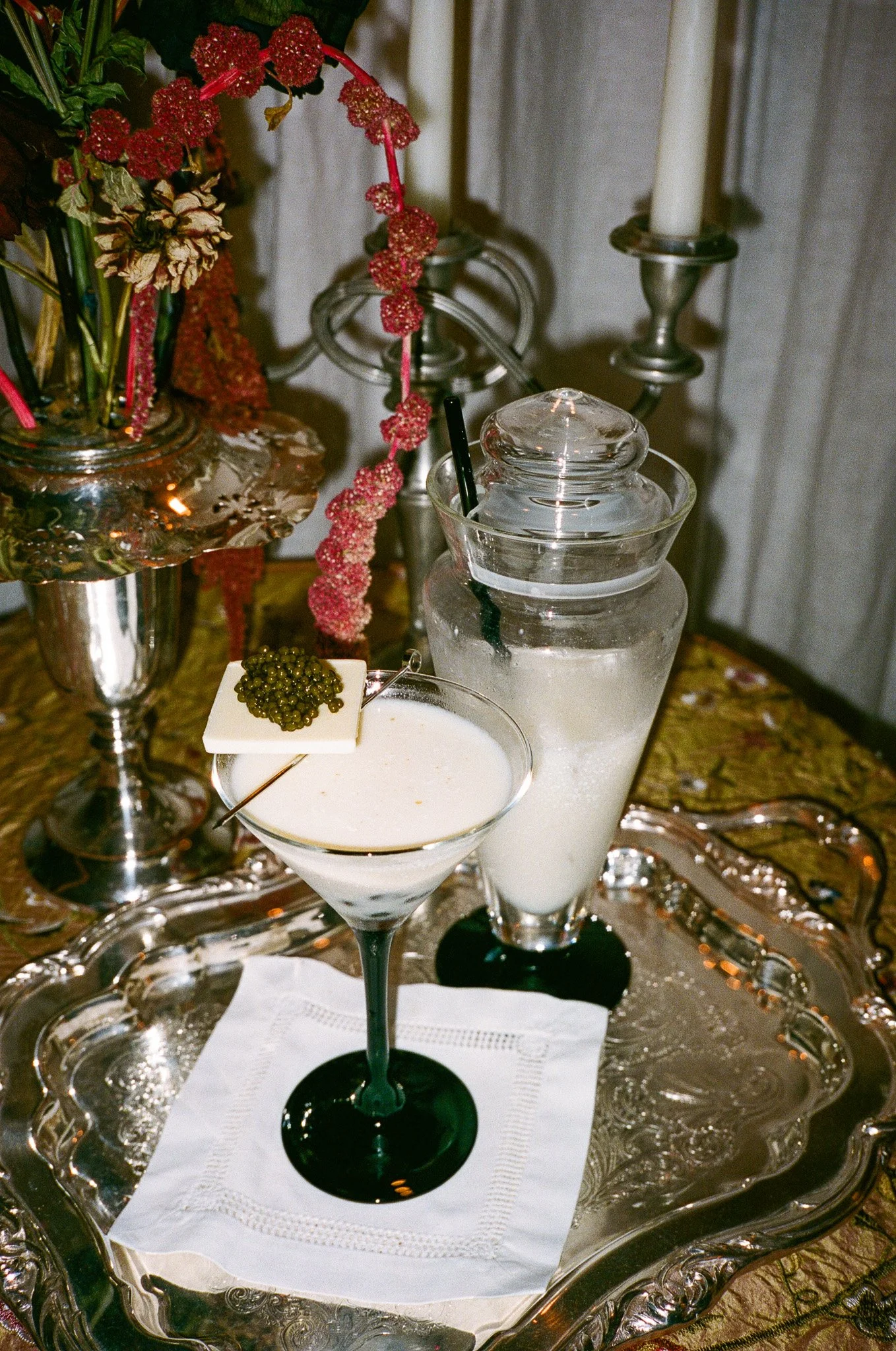 A white chocolate martini and a bit of spider eggs, a perfectly frightful cocktail for your All-Hallows-Eve.